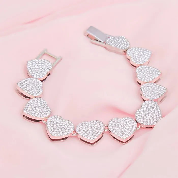 Say hello to the Heart of Glam Silver Pave Heart Link Chain Bracelet-where elegance and sparkle meet fierce femininity. Crafted from high-quality silver metal and fully embellished with clear pave rhinestones, this stunning bracelet features solid heart-shaped links that radiate sophistication. The hinged fold clasp closure ensures a secure fit, while the 14.5mm wide chain adds just the right amount of boldness to your wrist. Whether you're dressing up for a chic event or adding a touch of glam to your casual look, this bracelet knows how to make you shine.